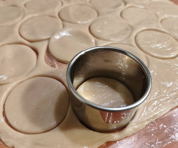 - Întindeți aluatul, decupați forma dorită. Resturile de aluat le strângeți și dați din nou aluatul la frigider și repetați procesul.