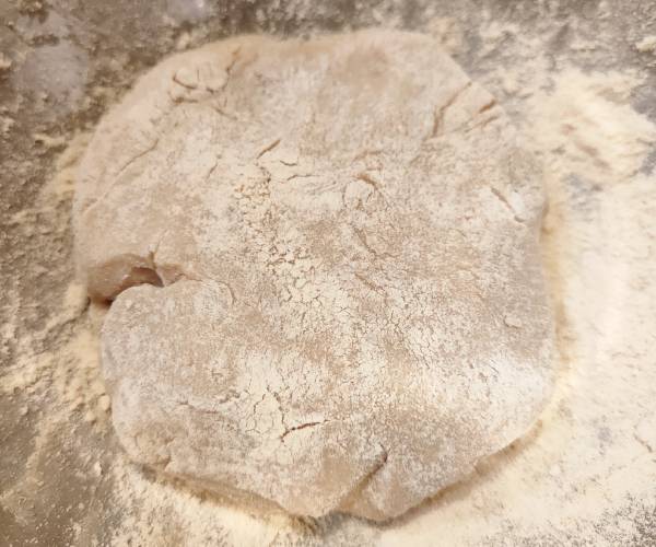 - Se amestecă cu o lingură ingredientele, la urmă se presară mai multă făină de migdale pentru a forma o bilă de aluat nelipicioasă.