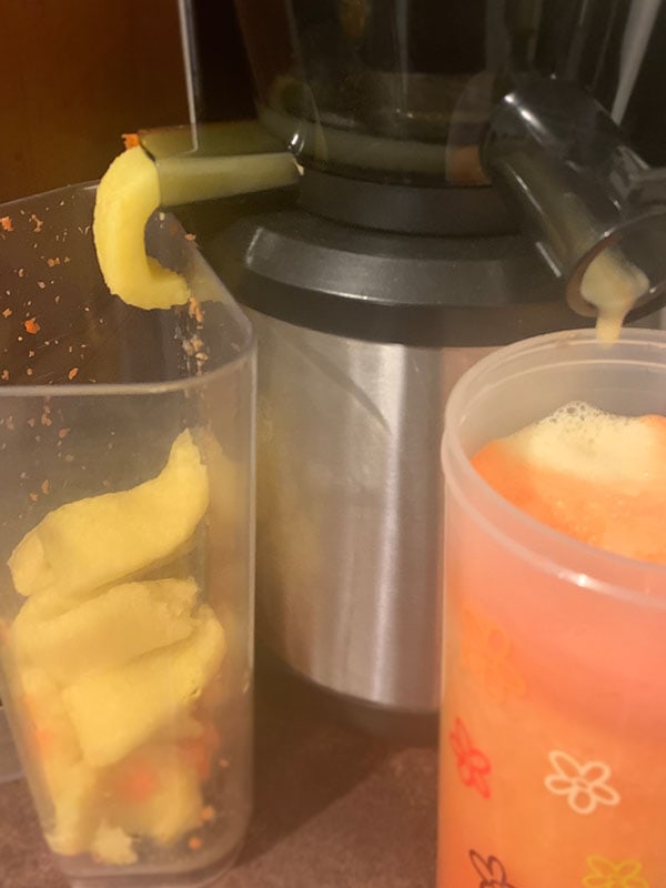 Am început să fac un suc de mere, morcovi si portocale. Portocala ajută să nu se oxideze pulpa de măr. Am folosit mere curățate de coajă și miez, morcovii la fel.