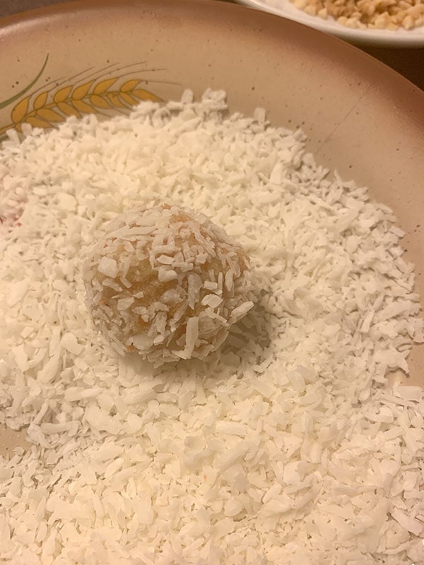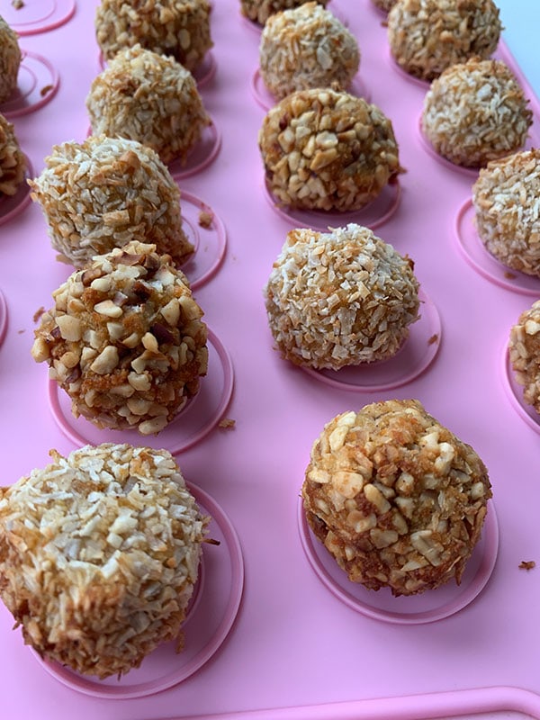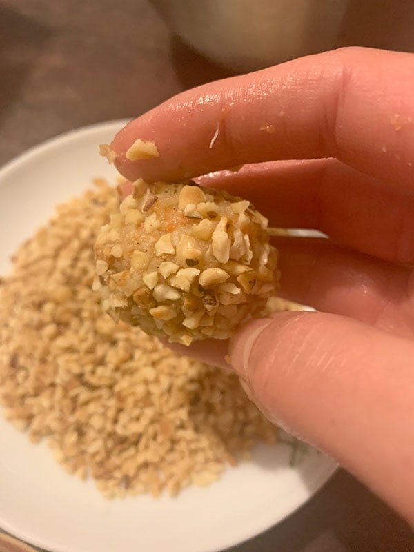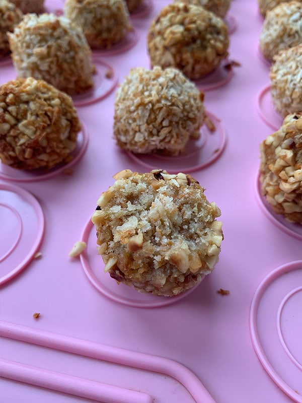 Acum format aluatul fără gluten în biluțe pe care le-am trecut prin alune mărunțite, o nebunie!