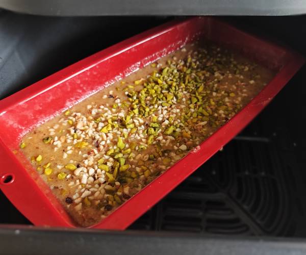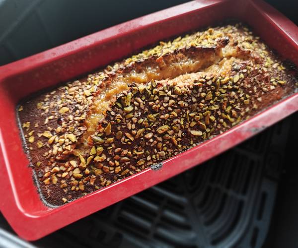 L-am copt la Air fryer-ul Instant pot, în tavă de chec de silicon. Coace perfect, ca un cuptor electric mare.