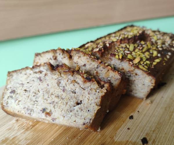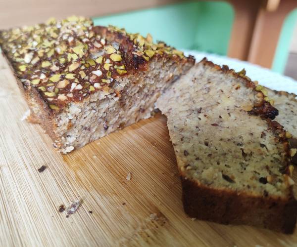 Mi-am făcut pentru cafea un chec delicios de banane, fără gluten, fără cereale, cu făină de alune de pădure și cu făină de migdale. Cu fistic și alune presărate deasupra, a avut aroma perfectă.