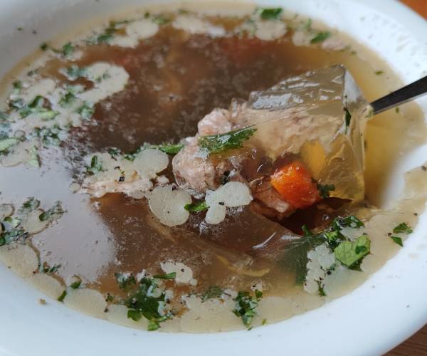 Rețeta mea de răcitură este inspirată din bucătăria italiană. Cu aceleași condimente și legume prepar și supa de oase. Iese o supă fină, aromată datorită condimentelor și legumelor variate. Culoarea este datorată legumelor și plantelor aromate, la fel și gustul deosebit care nu ar fi posibil doar cu carne și usturoi cum se face tradițional la noi.