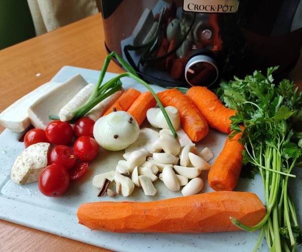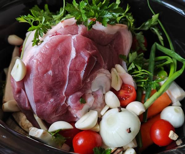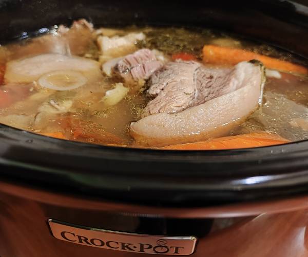 4. Am pus apă până la nivelul cărnii, a fost și maxim cât permitea Crockpot-ul. Am setat Crockpot-ul pe modul High, timp de 4 ore. Am deschis oala și am tăiat bucăți ciolanul, carnea deja se desfăcea de pe os ușor. Am mai lăsat două ore la High.