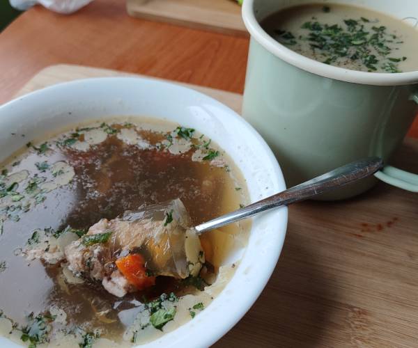 5. Când e gata se strecoară supa direct în castroanele de servire, se pune verdeață proaspătă și bucăți de carne în fiecare porție.